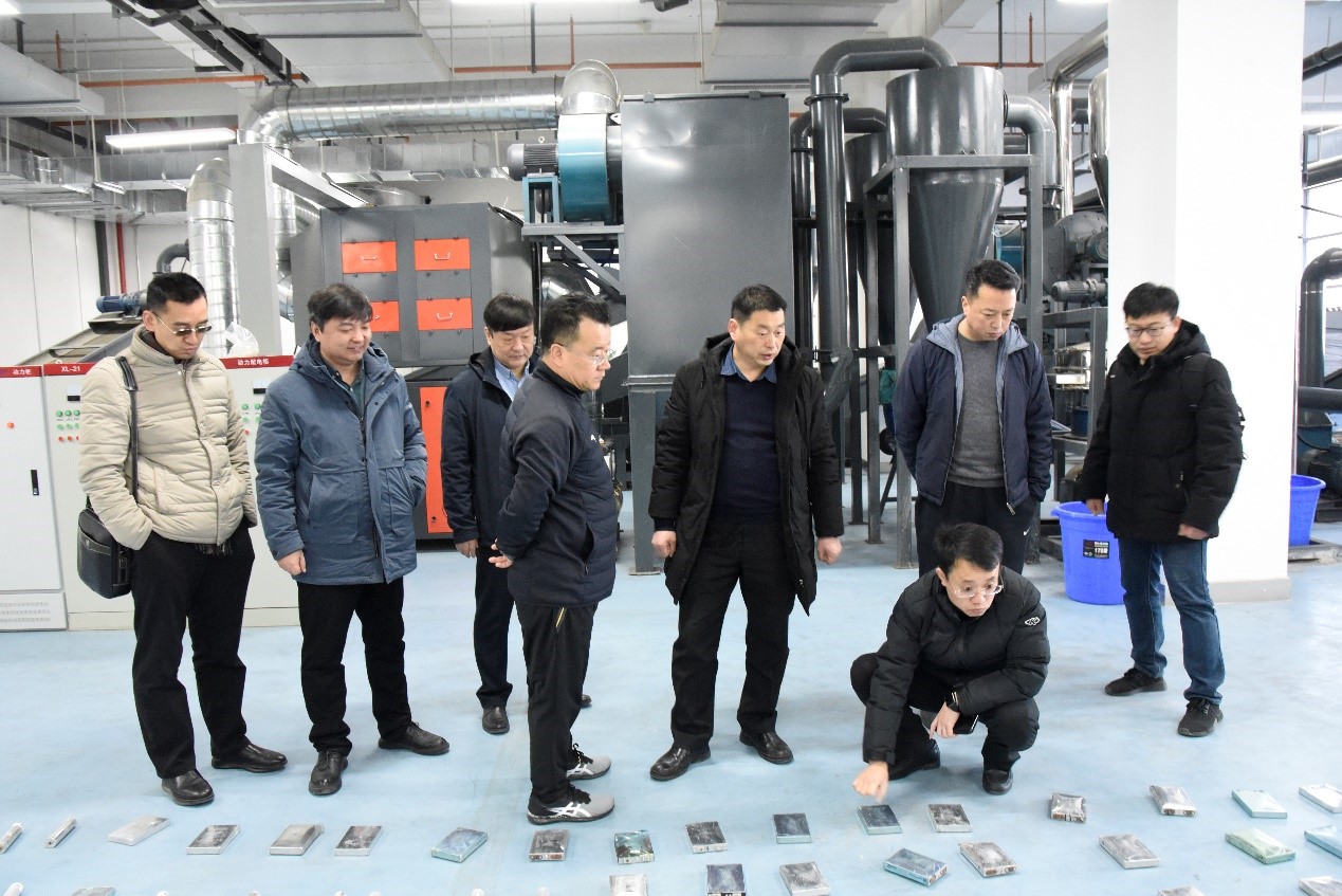 董志彬一行首先参观了锂离子回收中试设备。丁书江、杨国锐详细介绍了该中试设备的工作原理、工艺特点、技术先进性、回收利用效率以及环境保护等详细情况。经过不断科研攻关和技术迭代,该设备已经是第三代产品,中试效果良好,达到了设计效果,实现了废旧锂离子电池高效回收利用,且没有任何废液产出,废气经过处理后可达标排放,相关技术国内领先。