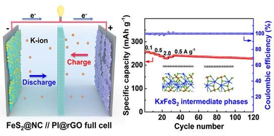 针对上述问题,必赢唯一官方网站高国新副教授、丁书江教授与剑桥大学石墨烯中心郗凯博士合作,采用一种新颖的吹泡泡法制备出氮掺杂碳包覆的铁基硫属族化合物二维纳米复合材料FeS2@NC),表现出优异的钾离子电池性能和应用前景。在0.1 A/g电流密度下进行钾离子半电池充放电测试,可逆比容量达到525.5 mAh/g;在10 A/g的高电流密度下的可逆比容量仍有154.7 mAh/g,循环寿命长达5000圈。与正极匹配后的钾离子全电池经120次循环后,容量保持率超过88%,库仑效率超过99.9%。密度泛函数(DFT)计算表明,硫化铁(FeS2)比硒化铁(FeSe2)表面更有利于钾离子的吸附和扩散,嵌钾中间相对钾离子吸附更强;氮掺杂碳包覆层进一步增强了电极材料和钾离子的相互作用。本工作提出的高性能电极材料设计思想和电化学反应机理研究为开发可实用化高性能电极提供了借鉴。