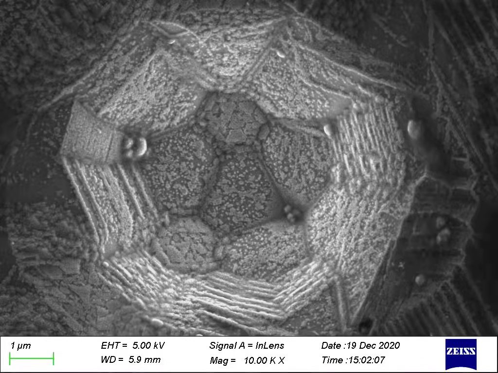 《夕阳下的霓虹都市》通过对扫描电镜拍摄的多孔Al阵列的截面SEM图进行简单上色处理,得到一副夕阳下的城市缩影图。在这繁华的都市里我们总是很容易迷失方向,迷失自我。但是,既然选择从事科研工作,就要经得住诱惑,守得住初心,坚定信念,辨明前进的方向,才能不被外物的光所遮掩,最终走到最美的终点!