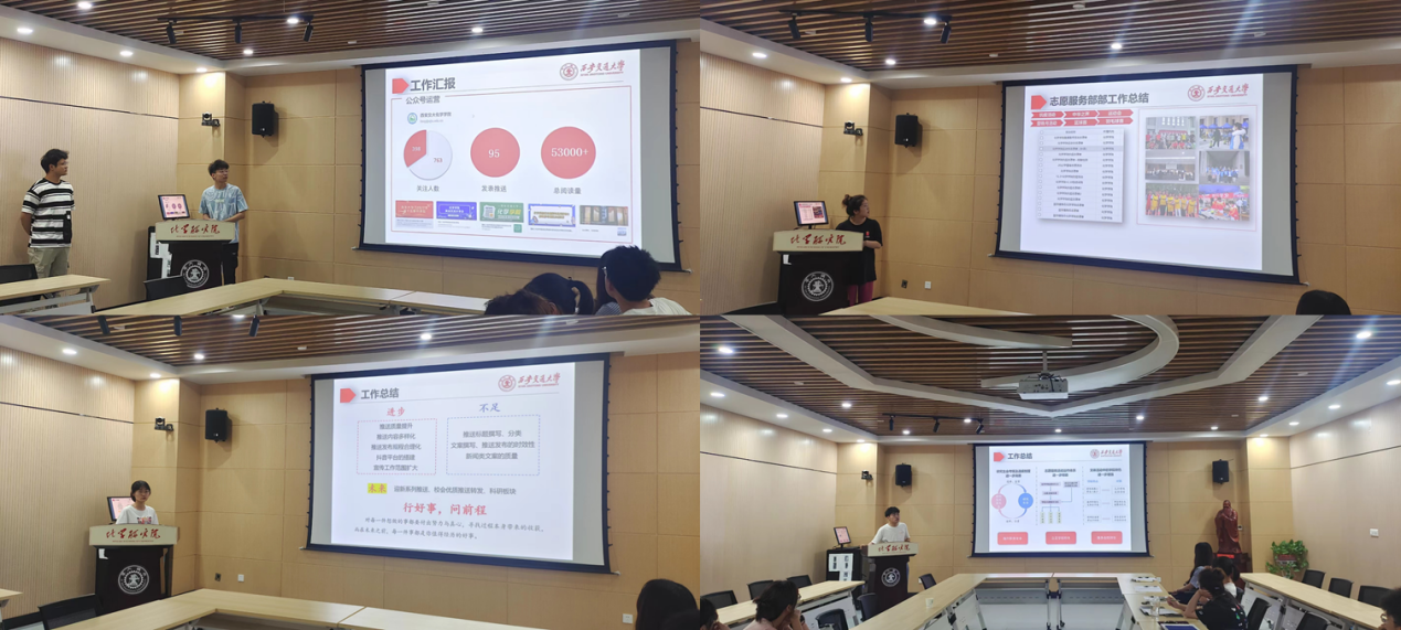 办公室、学术部、文体部、志愿者服务部部长以及主席团成员分别对2021至2022年所分管的工作进行总结,并对工作中出现的问题与不足作出反思与改进。