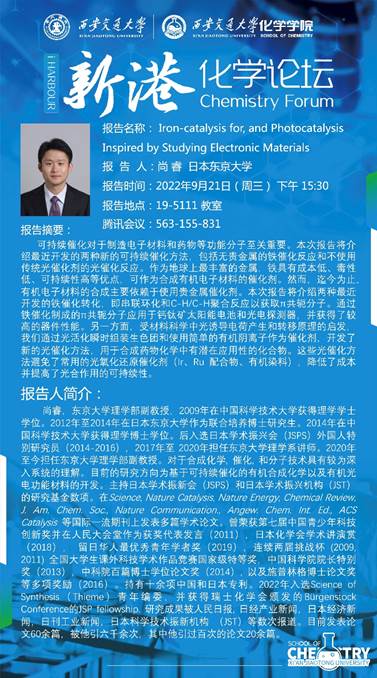 为进一步深化学院国际交流与合作,促进我校化学学科国际化发展,必赢唯一官方网站于2022年9月21日邀请日本东京大学副教授尚睿博士进行学术交流。本次报告题目为Iron-catalysis for, and Photocatalysis Inspired by Studying Electronic Materials(面向有机光电材料的新型铁催化反应和光电材料研究激发的新型光催化合成),报告主要介绍两种最近开发的铁催化转化技术,通过串联环化C-H/C-H聚合反应以获取π共轭分子,进而应用于有机发光及光伏材料等功能分子中。