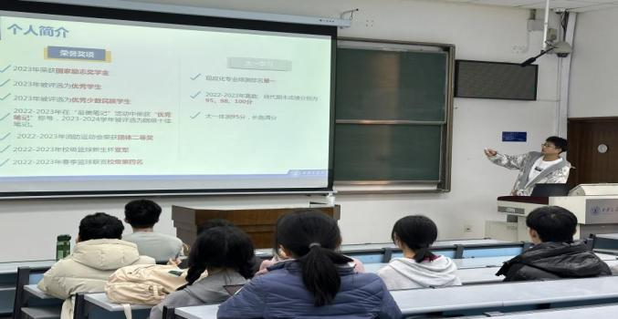 下午五点,在化学2301班班主任胡敏老师主持下,应化专业二年级本科生孙继远同学向学弟学妹们分享学习心得。在本次分享中,针对同学们普遍反映的高等数学、线性代数等课程进度快、课堂学习效果有限等困难,孙继远同学分别从学习习惯、学习方法、复习备考策略以及自习场地选择等多个方面向大家分享了自己的经验,提出了数条切实可行的建议和参考。参加分享会的同学们和孙同学进行了热烈交流,大一年级的班主任老师们也结合自身的教学经验给同学们提出了关于复习进度安排、答疑和实践学习等方面的建议。
