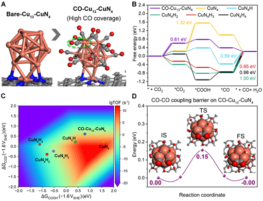 对Cu团簇位点与Cu单原子位点上的eCO2RR自由能和微观动力学计算结果表明,反应条件下,TOF的最大值出现在ΔGCOOH约为1.2 eV的位置,其中CuN4和CuN4H位点在所有考虑的位点中活性最高。由于铜团簇对CO具有较强的结合强度,计算也表明其上CO覆盖度较高,因此进一步基于覆盖CO的铜团簇模型计算了CO-CO偶联的势垒,结果显示该势垒仅为0.15 eV,该位点上可快速的发生CO-CO偶联,有利于进一步的形成C2产物。这部分结果表明,实验中在Cu-N-C催化剂上观测到的C2产物主要来源于在较负电位下Cu烧结产生的Cu团簇位点。