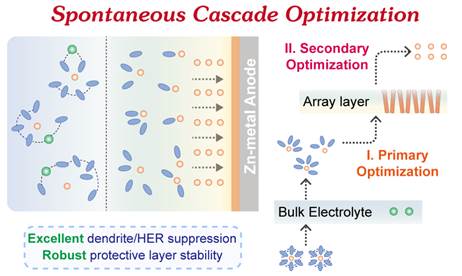 鉴于此,必赢唯一官方网站丁书江教授课题组首次提出自发级联优化策略。通过自由基聚合在锌负极上构建了可自发分离-重构的保护层(PAPE@Zn)。PAPE层内含有水溶性差的聚丙烯酰吗啉(PACMO)和溶解性好的聚氧化乙烯(PEO)。在电解液的诱导下,PEO可自发分离到本体电解液中与H2O相互作用,从而对锌离子的溶剂化结构实现初步调控,并且降低了PACMO层的脱溶剂化压力,从而提高了其稳定性,实现了初级优化。与此同时,溶解性差的PACMO在锌负极上重构为疏水的花状阵列结构,该阵列具有丰富的亲锌位点,可进一步促进Zn2+脱溶并有效的均匀锌离子通量,从而完成二级优化。使用 PAPE@Zn 的对称电池在1 mA cm-2下实现了4000小时的稳定循环。基于V2O5的全电池可在15 A g-1的高电流密度下实现大于12000次的超长循环。在0.6的超低N/P比和高负载量(约17 mg cm-2)下可稳定循环1000次,累积容量达2.32 Ah cm-2。级联优化策略将负极保护拆分为两个目标,通过逐步优化实现了锌离子电池性能的全面提升,为锌负极保护层的结构设计提供了新的见解,同时也有望应用于其他金属电池的研究。