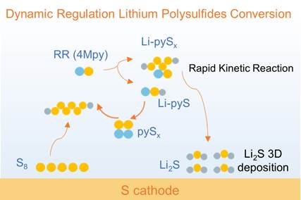 鉴于此,西安交通大学郗凯教授团队提出了一种氧化还原调节器型(RR)的电解液添加剂的策略,通过在电解液中加入4-巯基吡啶(4Mpy)动态调节多硫化物转化路径。这种RR型添加剂不仅减缓了多硫化物的穿梭,也减缓了添加剂自身的穿梭问题。研究发现,4Mpy添加剂的氧化还原转化机制不同于传统电解液,4Mpy能够形成吡啶硫醇锂(Li-pyS),在充电/放电循环过程中可逆参与多硫化物转化,动态调节多硫化物向硫化锂的转化路径,显著改善氧化还原过程并促进Li2S的三维形成,从而增强反应动力学。因此,具有4Mpy添加剂的锂硫电池在10.88 mg cm-2的高硫负载下放电容量达到10.05 mAh cm-2。这项研究不仅提出了一种解决多硫化物缓慢转化动力学的方法,还为其他同类型溶解-沉积型金属电池的电解液设计提供了宝贵的见解。此工作以“有机硫电解液添加剂在锂硫电池中动态调节多硫化物转化路径”(Dynamically Regulating Polysulfide Degradation via Organic Sulfur Electrolyte Additives in Lithium-Sulfur Batteries)为题发表在《先进能源材料》(Advanced Energy Materials)上。博士生邓腾是本文的第一作者。参与本工作的还有西安交通大学丁书江和唐伟教授、王嘉楠和赵洪洋副教授、北京化工大学刘亚涛副教授、郑州大学付永柱教授等。