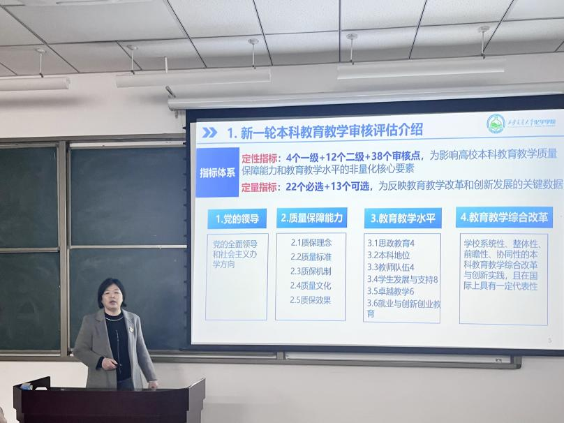 李银环从实施背景、指标体系等方面强调了新一轮本科教育教学审核评估工作的重要性,明确学院层面应当以评促建,以评促改,扎实开展,广泛学习,配合学校推进工作,巩固教学工作的中心地位。同时,学院将通过成立工作小组、制定工作方案、明确目标及时限,责任到人等逐步推进落实教学评估工作,及时发现问题和不足,完善本科教学建设、教学改革和教学管理工作。
