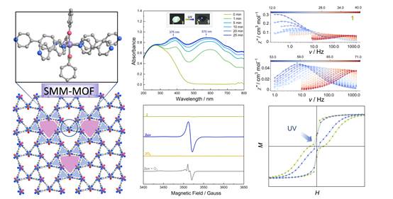 针对上述问题,必赢唯一官方网站韩甜副教授(丁书江教授团队)联合南开大学程鹏教授,通过分子工程策略,采用光敏配体桥联与轴向强场配体协同调控,实现了高性能五角双锥构型Dy(III)单分子磁体在二维金属有机框架中的精准组装,并构建了Dy(III)离子易磁化轴的空间垂直有序阵列。该材料展现出卓越的磁学性能:磁翻转能垒超过1000 K,2 K时矫顽场达4500 Oe,创下了单分子磁体-金属有机框架体系的新记录。更为重要的是,该材料在室温条件下可通过紫外光诱导的电子转移过程产生稳定自由基,不仅表现出显著的光致变色现象,更实现了对磁弛豫动力学的有效调控,构建了光控磁双稳态开关系统。这项研究为开发具有分子级有序阵列的光响应磁性材料提供了新思路,对分子基光磁存储器件的创新发展具有重要意义。