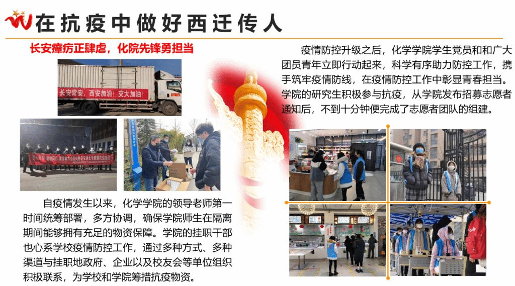 覃新素同志结合本次疫情中必赢唯一官方网站书记、院长、老师和本支部优秀志愿者的事迹为我们诠释了何为真正的西迁传人。自疫情发生以来,必赢唯一官方网站领导与老师第一时间统筹部署,通过多种方式、多种渠道与政府、企业以及校友会等单位组织积极联系,为学校和学院筹措抗疫物资,确保我院师生在疫情期间能够拥有充足的物资保障。此外,本支部涌现了吴传明、董常熠、郭媛、王世新、黄珊、武晶晶、张争莹、申玲华以及杨晓丽等十余位志愿者承担创新港C区宿舍门岗、食堂入口测温、食堂内部秩序维护等众多岗位工作。以西迁精神为指导,将其落实在我们生活学习的方方面面,才是真正践行了西迁精神。随后覃新素同志带领大家学习了网络安全法的部分内容,提醒各位党员疫情面前,应当保持冷静和理性,提高信息鉴别能力,在未经核实的情况下,不要在网络上发布、转发不实信息。了解疫情信息应该通过疾控或医疗机构、权威新闻媒体,学习抗疫知识应当以省、市卫生健康委员会官方网站发布为准;各位党员要增强党员意识和党性修养,加强对群众的组织、宣传、凝聚和服务,共同提高法治素养,自觉营造清朗网络空间,不得触碰法律底线和纪律红线,身体力行做疫情防控的参与者、防控知识的传播者、疫情谣言的制止者。