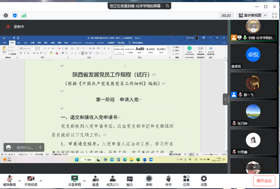 首先由必赢唯一官方网站兼职辅导员封婕同学向大家解读了陕西省发展党员工作流程,封婕结合学校发展党员工作情况,从申请入党、入党积极分子阶段、发展对象阶段、预备党员的接收以及预备党员的转正五个方面对党支部学生干部的工作内容进行了详细介绍。分享结束后,法学院的学生干部们积极提问,大家进行了进一步的交流学习。活动最后,法学院的张乃钟老师指出党支部共建活动是促进两个支部共同进步的有效方式,理工科与文科的相互学习更能使党支部活动有新的发展与突破,同时她也提醒大家党支部工作是一个需要认真对待的事情,大家对待党支部的工作务必要严谨仔细。