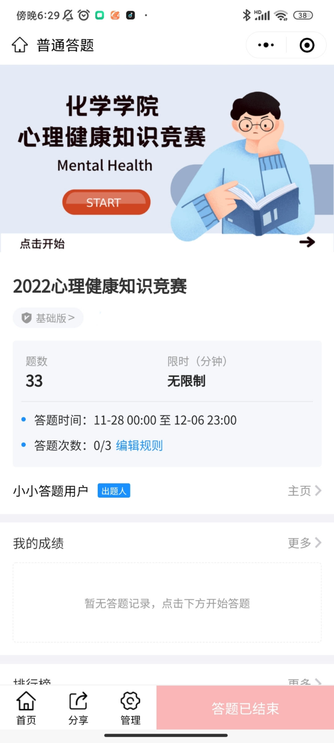 为进一步深化心理健康教育的效果,增加同学们的心理健康知识储备,提高整体心理健康知识水平,我院于2022年11月28日-2022年12月5日在必赢唯一官方网站微信公众平台上发起了心理健康知识竞赛,本次竞赛共有60余名同学参与答题,85%的同学取得了很好的成绩,我院按照排名顺序先后对参赛同学给予了奖励。