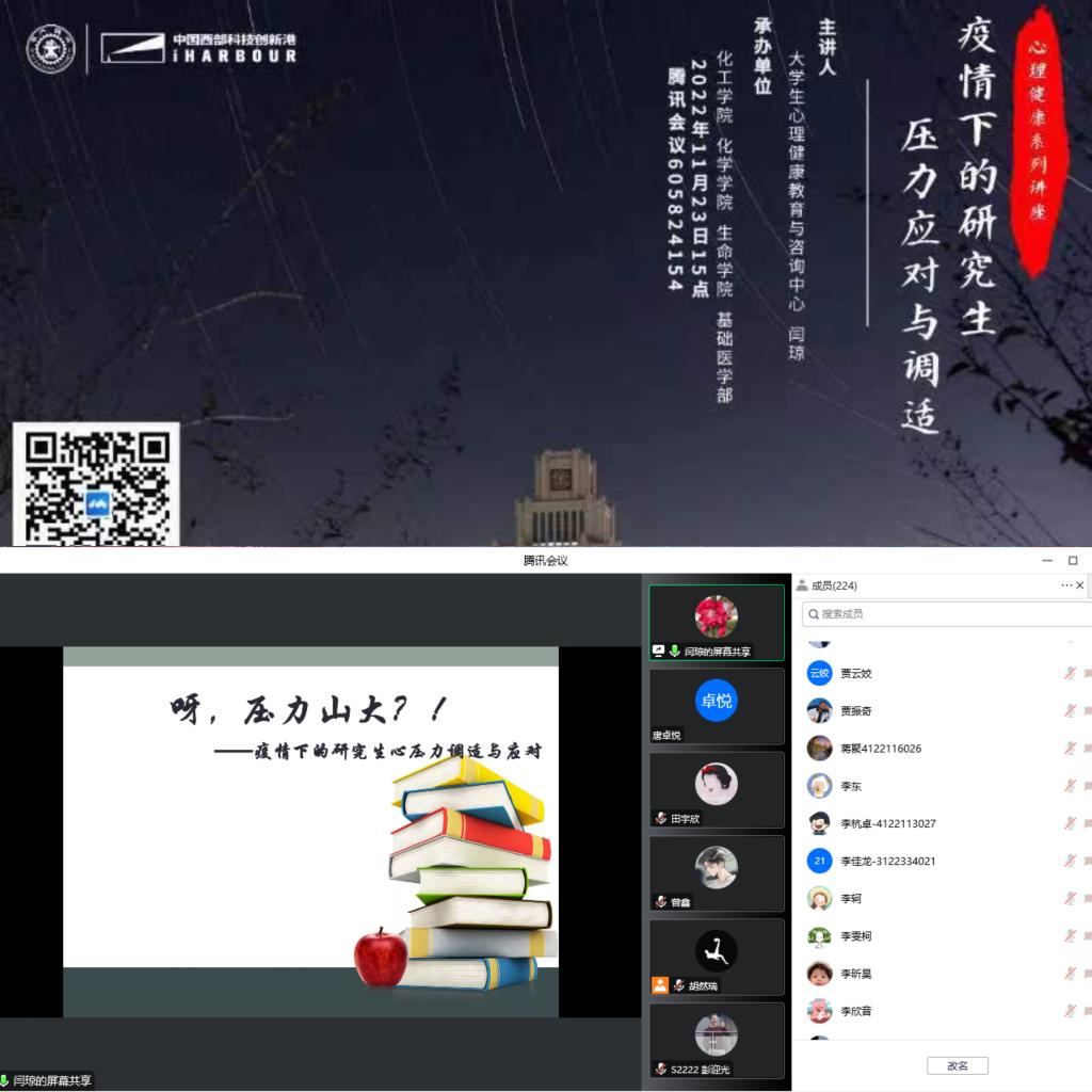 为向研究生普及心理健康知识,我院联合化工学院、生命学院、基础医学院邀请了大学生心理健康教育与咨询中心闫琼老师于2022年11月23日开展了主题为“疫情下的研究生压力应对与调适”的讲座。本次讲座累计有402人参会,达到了良好的心理健康教育效果。
