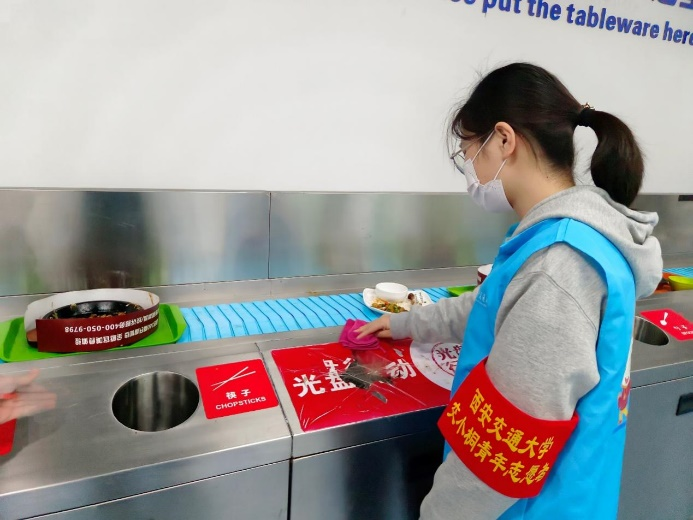 志愿者们佩戴袖章,在食堂内引导就餐同学有序排队,引导同学们用餐期间不剩菜、不剩饭,保持餐桌卫生,提倡光盘行动。积极帮助食堂工作人员收拾餐桌,将同学们剩下的食物残渣收拾干净倒入垃圾桶。在餐具回收处,帮助保洁人员收拾整理餐具。参与活动的志愿者纷纷表示,律人先律己,在要求和帮助他人的同时应更加严格地要求自己。要勤俭节约,牢记艰苦奋斗的精神,明白每一粒粮食的来之不易,时刻保持敬畏之心,才能够倍加珍惜今天来之不易的幸福生活,不浪费每一粒粮食。