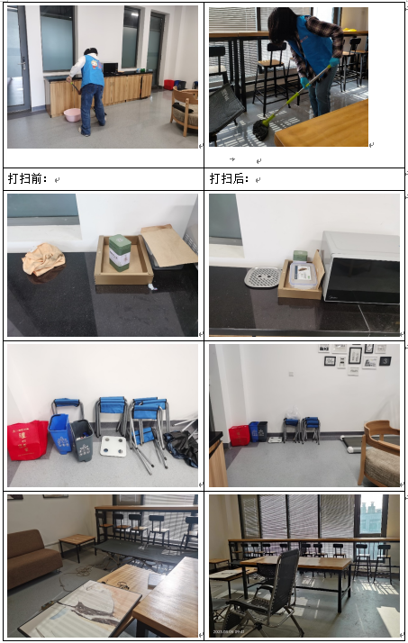 在这次活动中,我们分配的项目是让一间闲置的会议室变得干净整洁。虽然听起来是一件普普通通的事,但整个过程下来,我享受其中,享受议室变化后的干净整洁,享受认真做事,全身心投入的个人状态,享受做了一件有意义的事以后的喜悦感。在整理过程中,我甚至设想到,在今天之后使用这间会议室的老师或者同学们,在这样干净整洁的环境里,是不是能迸发出更强的力量,提出更多更好的想法。想到这里,手中的进度都会不知不觉的加快,只为了更快更好的完成整理,为会议室迎来“新生”。