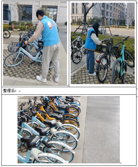 自行车可以说是学校的一部分文化了,日常生活中很多同学上课都骑自行车。各式各样的漂亮的自行车已经成为一道风景线,但自行车的不整齐的摆放会直接影响到校园的美观。今天在学院研会的组织带领下,我和同学们一起摆放学院门口的自行车,来使校园更整洁、更美丽。
