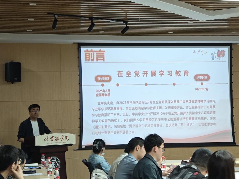 会议第四项,支部书记成一龙老师带领学习《深入贯彻中央八项规定精神学习教育专题》。开展深入贯彻中央八项规定精神学习教育,是巩固深化主题教育和党纪学习教育成果、纵深推进全面从严治党的重要举措,是密切党群干群关系、巩固党的执政基础的必然要求,是推进中国式现代化的有力保障。我们要充分认识这次学习教育的重要意义,做到锲而不舍贯彻中央八项规定精神,推动党的作风持续向好,推动党中央各项决策部署落到实处,为推进中国式现代化贡献智慧和力量。