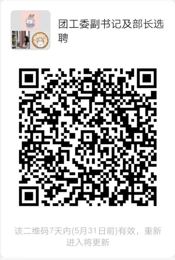 3、竞选团工委学生副书记和直属部门负责人的同学请填写《必赢唯一官方网站团工委学生副书记、直属部门负责人申请表》(扫描下方二维码下载)。文件以“拟竞聘岗位+姓名”形式命名,将WORD和PDF扫描版本的申请表发送邮箱noora_enactus@163.com,邮件主题命名与申请表相同,截止日期:2022年5月26日24点。
